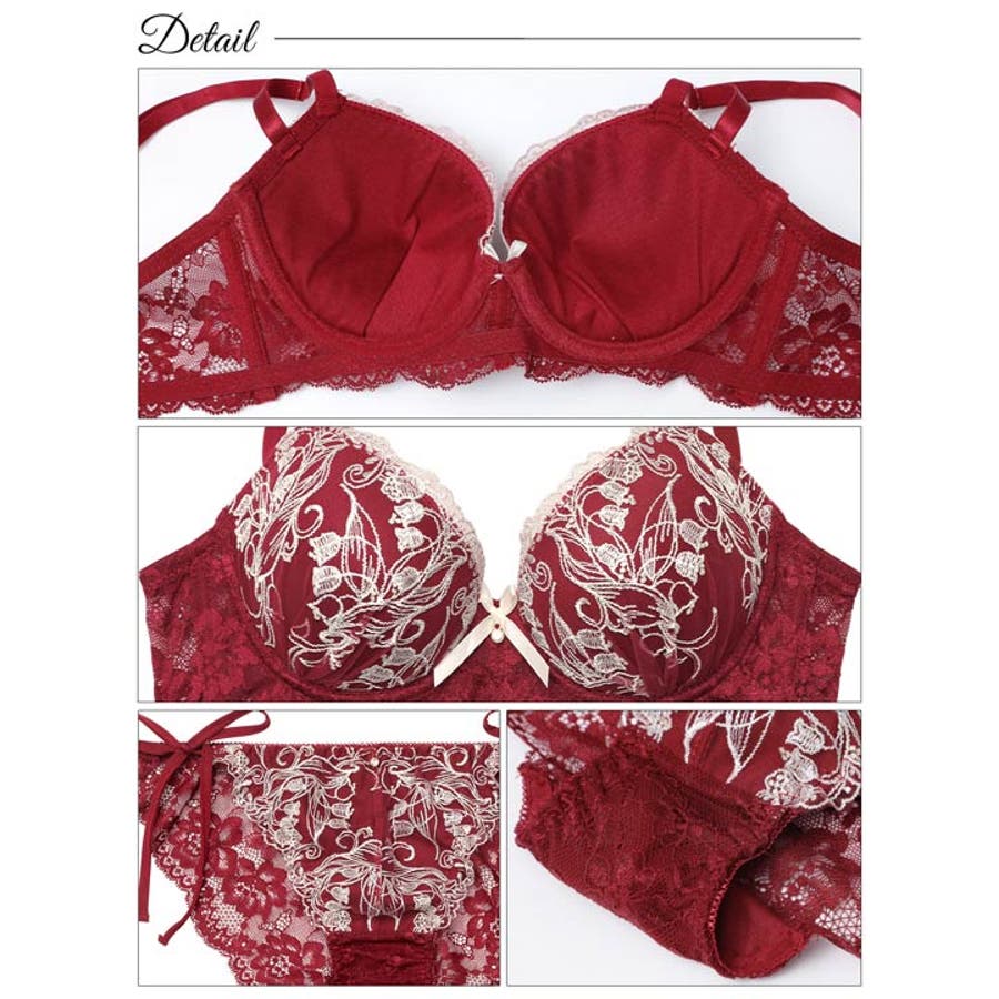 繊細に刺繍されたすずらんの花々が胸元を飾る上品で大人可愛い雰囲気のランジェリー。中心にはきらめくチャームとサテンリボンがあしらわれ華やかさをプラスします♪ショーツは解けるサイド紐×バック透けレースのセクシーなデザインで特別な日にもぴったりです◎