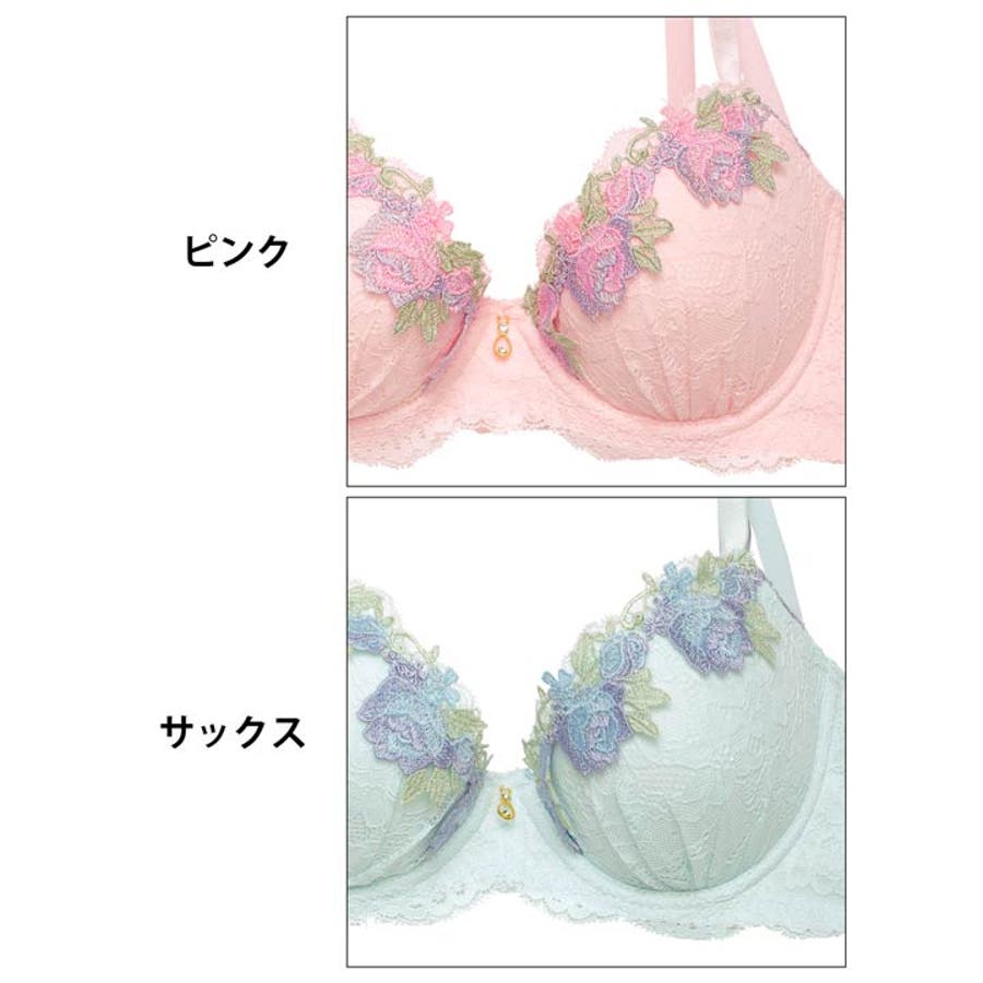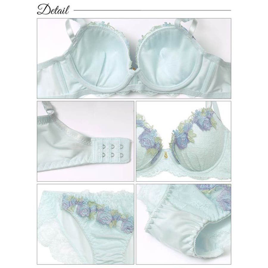 やわらかいパステルカラーのレースに、お花モチーフのケミカルレースをあしらったフェミニンなランジェリー。胸元にきらめくゴールドのチャームが高級感をアップさせます!ショーツの脚口はレース仕上げなのでお洋服にラインが響きにくい仕様です◎