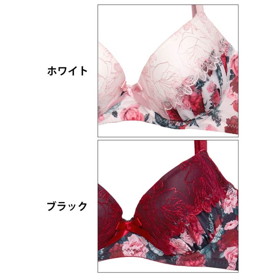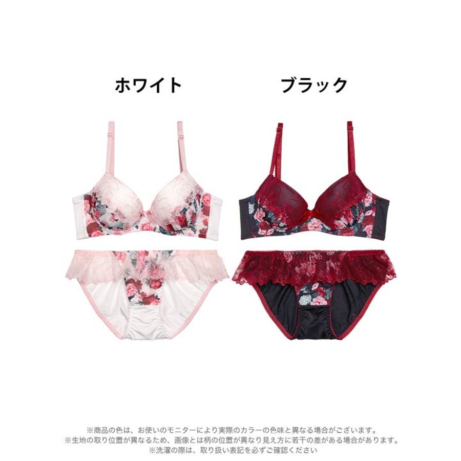 色鮮やかなローズプリントに透け感のある幅広なレースを重ねた高級感漂うランジェリー。ローズ柄のレース越しに透ける素肌が色っぽい印象に◎ 脇高仕様でバストラインを美しく見せてくれるのも嬉しいポイントです♪