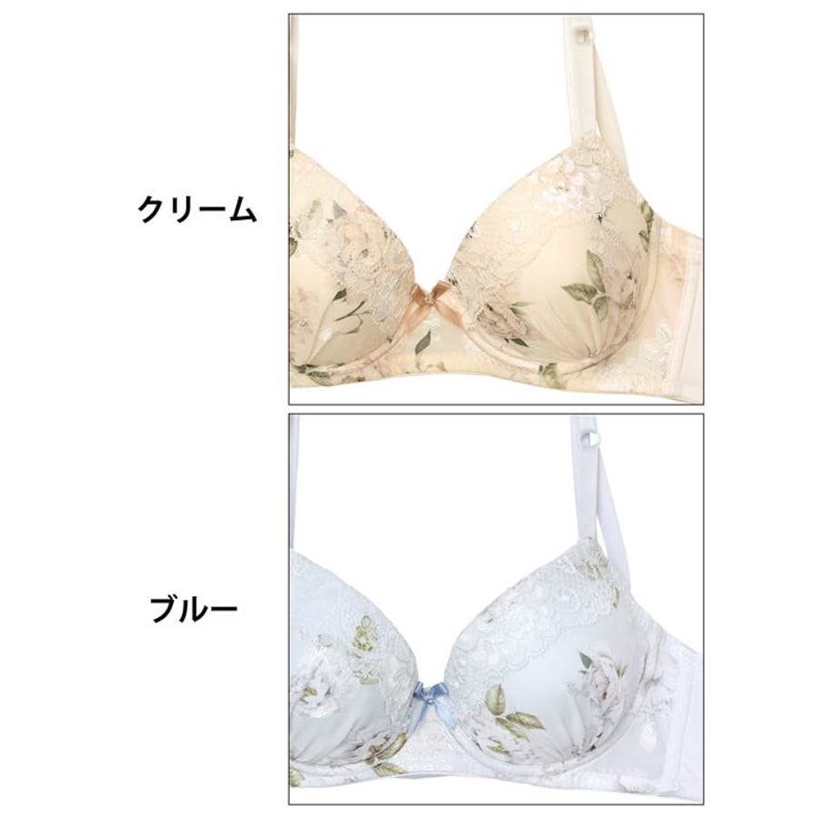 淡いカラーのフラワープリント×レースが優しい印象を与えるフェミニンなランジェリー。胸元とショーツフロントのリボンが可愛さをアップさせるポイント!脇高設計でバストを逃がさずキャッチし、美谷間&美シルエットをメイクしてくれます◎