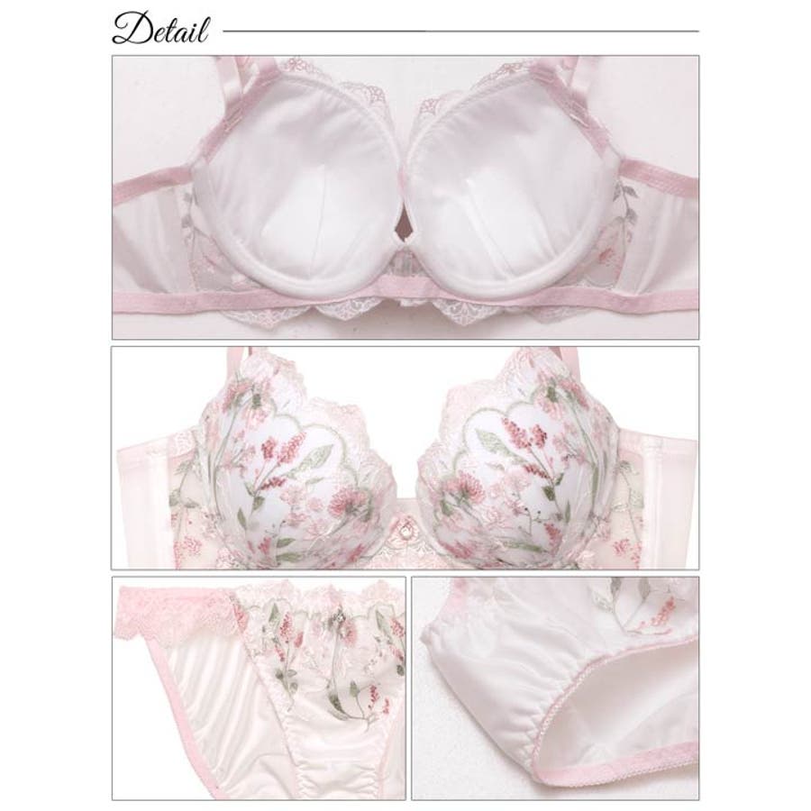清楚感溢れるホワイトの生地にクラシックなフラワー刺繍が美しいランジェリー。