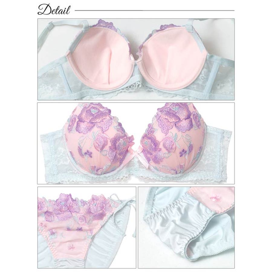 女の子らしい色鮮やかなピオニー刺繍が美しいランジェリー。甘く優しい色合いのパステルカラーと合わせた配色がフェミニンな雰囲気をプラスします◎ ショーツはリアルに解けるサイド紐でちょっぴりセクシーさも取り入れました♪モデル…karin