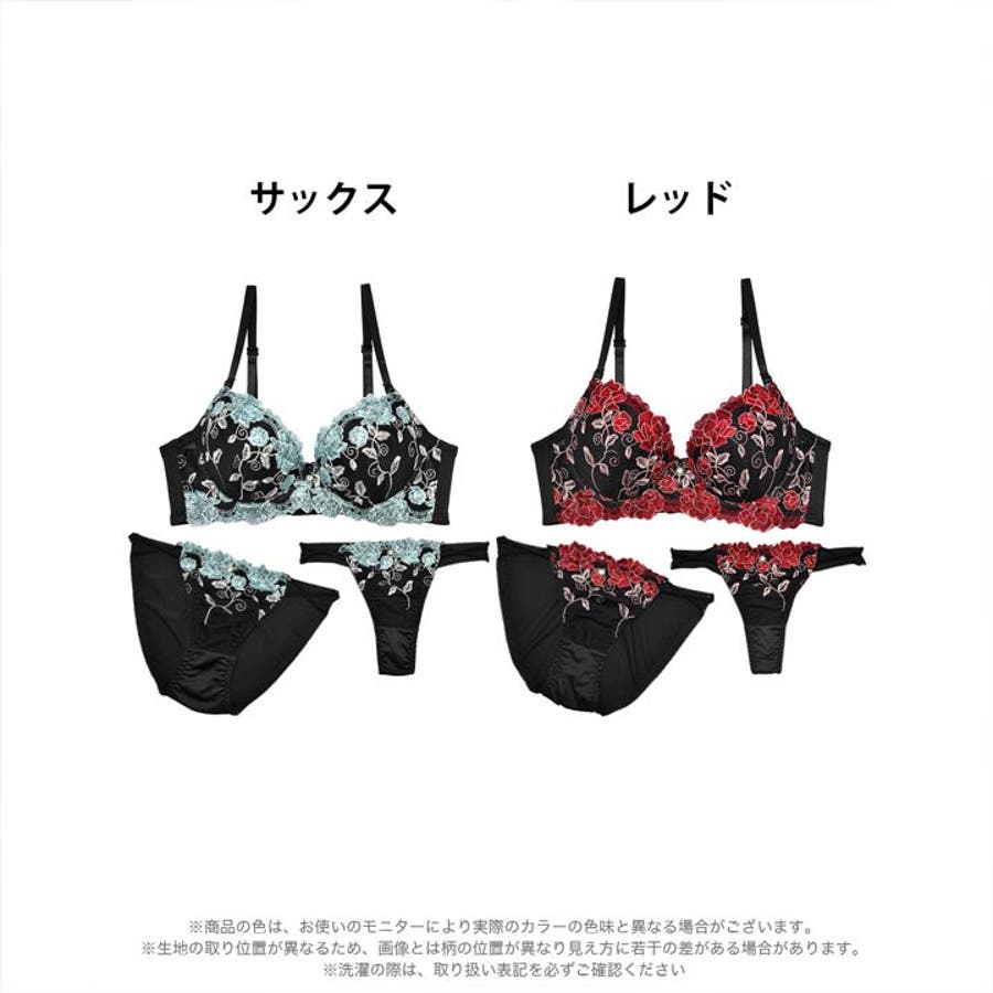 色鮮やかなローズが咲き誇るランジェリー。カップを囲うような贅沢なレース使いも高級感をプラス◎ クロスされたストリングデザインのショーツはフルバック、Tバック両方付いていてお得な3点セットになっています♪
