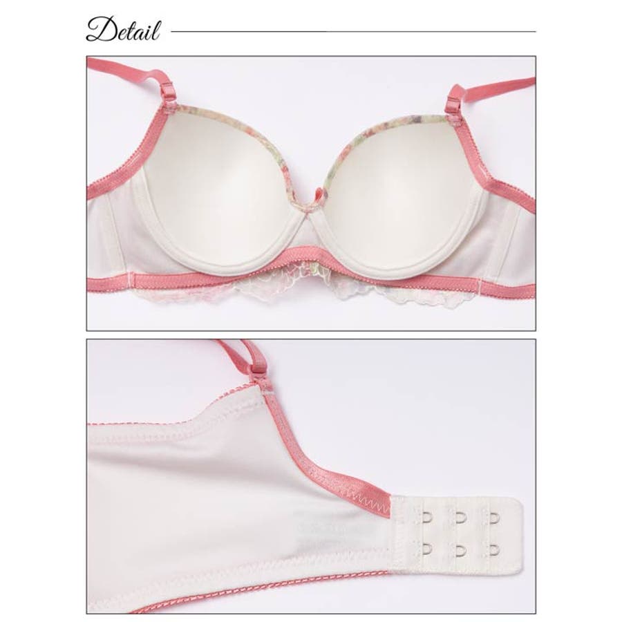 可愛らしいフラワープリントに上品な刺繍レースを重ねたやわらかい色使いのランジェリー。中心にはサテンリボンを飾りガーリーな装いに♪ショーツはヒップ全体を包み込んでくれるフルバック仕様で安定感のある履き心地です◎