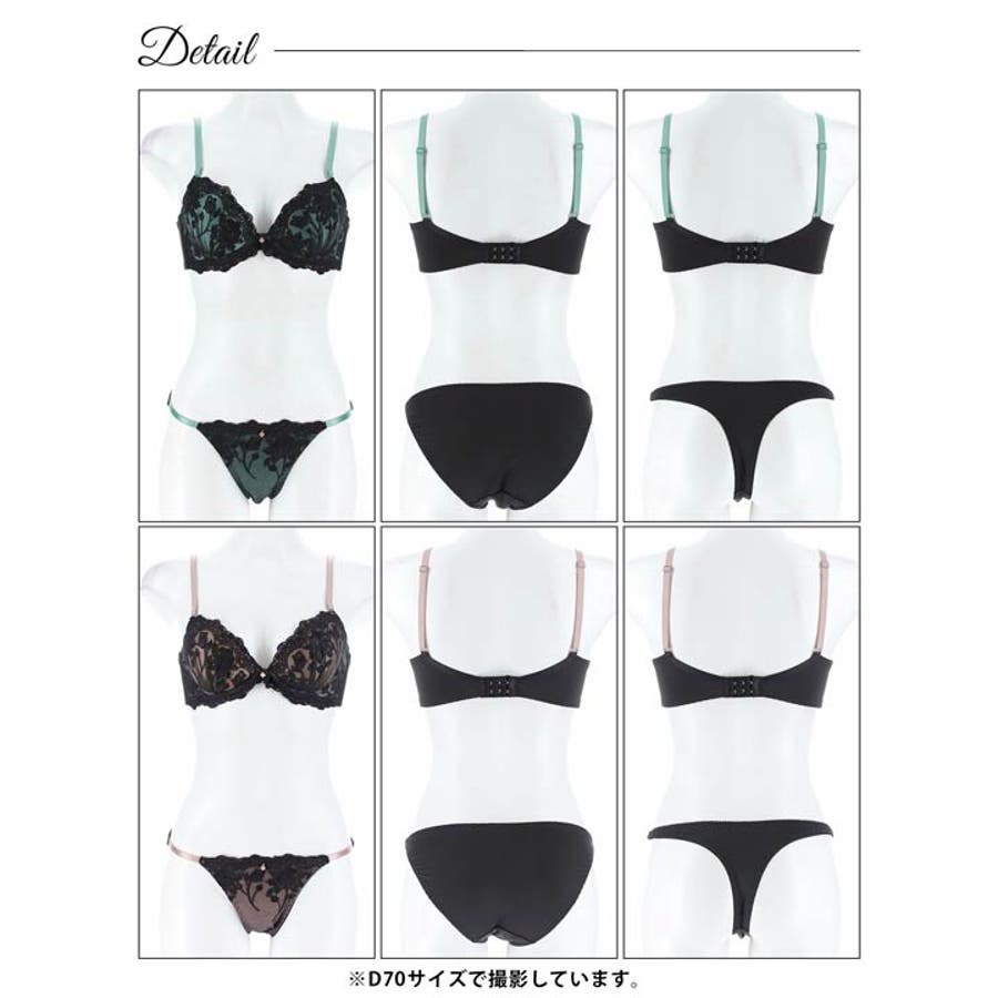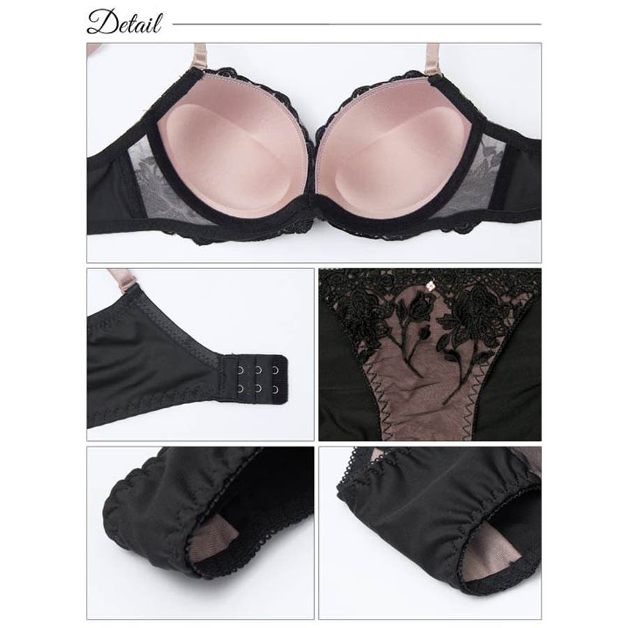 クラシカルで美しいフラワー刺繍入りのブラックレースをカップに重ねた大人上品なバイカラーのランジェリー。中心にきらりと光るダイヤ型のジュエルチャームが高級感をプラス◎フルバック・Tバックが両方ついているので場面に応じて使い分けできるのも魅力的です♪