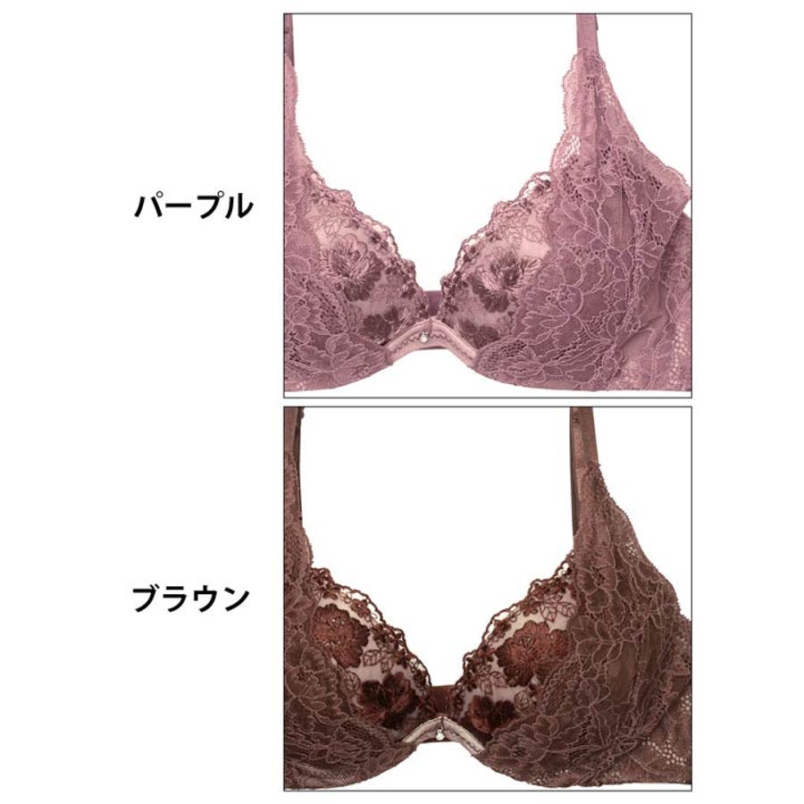 フラワー刺繍にレースを重ねた立体感のあるデザインが華やかで上品な印象のランジェリー。