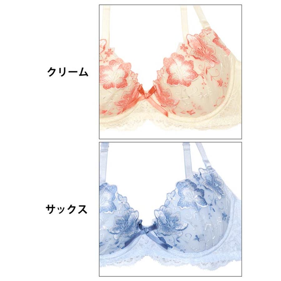 胸元を彩るフラワー刺繍と、カップまわりを囲むレースが上品&清楚な印象を演出するランジェリー。