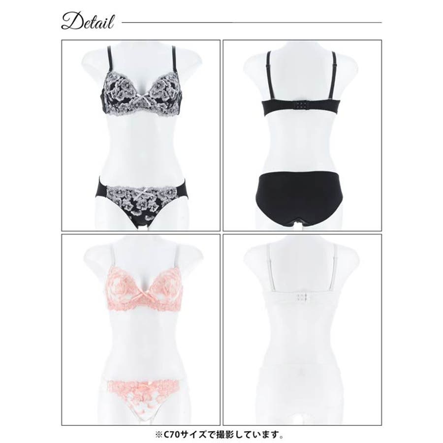 ブラック・ホワイトの生地に咲き誇る花々の刺繍が美しいランジェリー。
