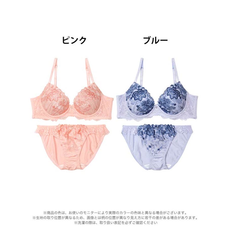 爽やかな色合いのレースに大花刺繍をたっぷり施した大人可愛い印象のランジェリー。