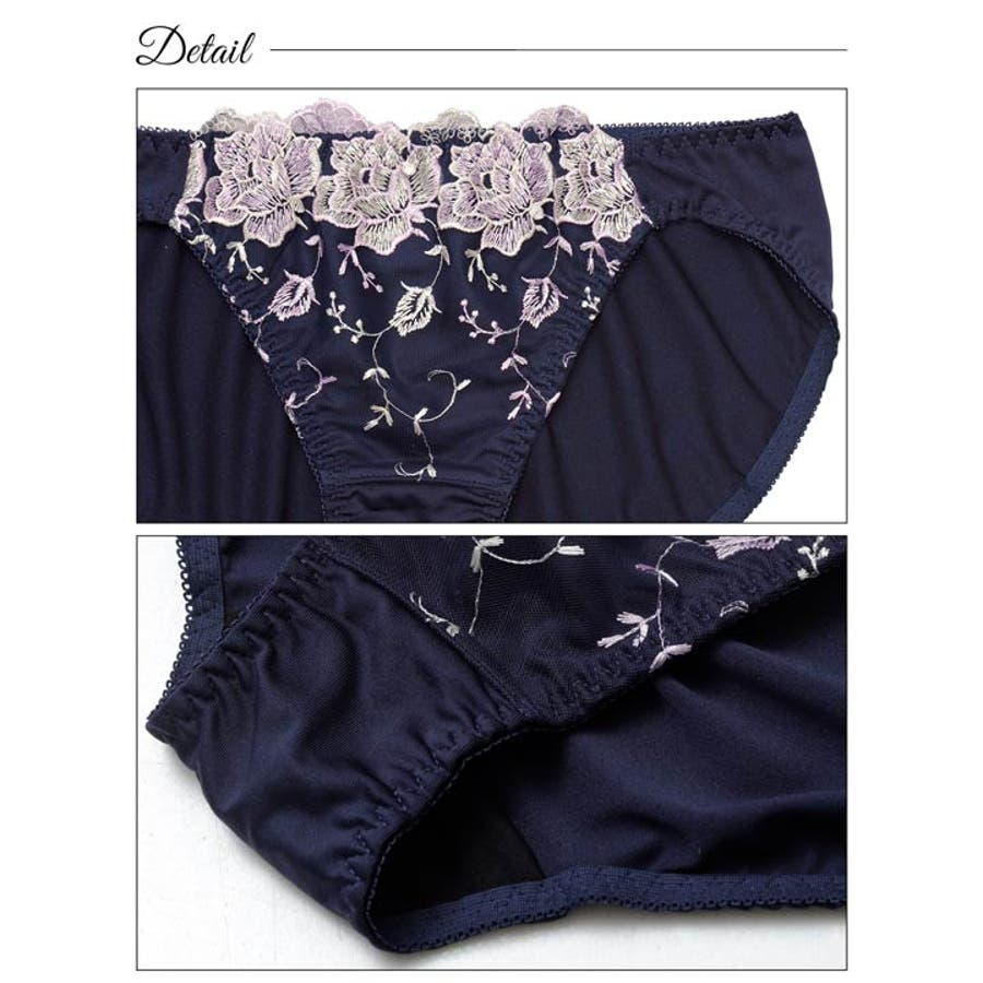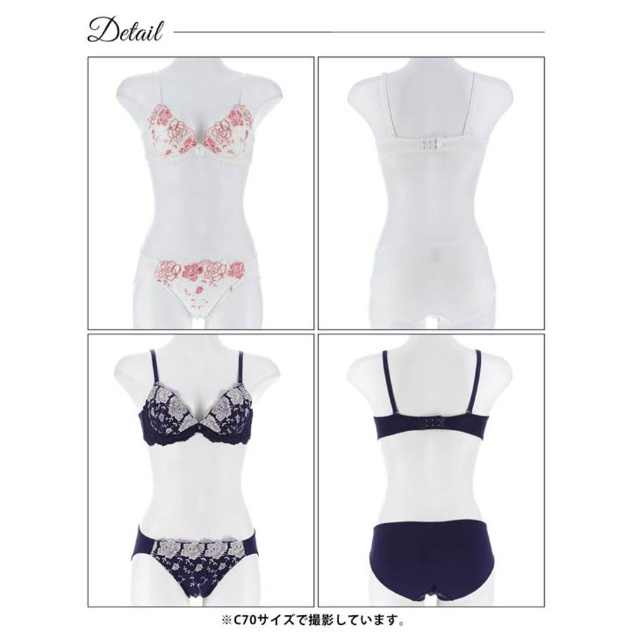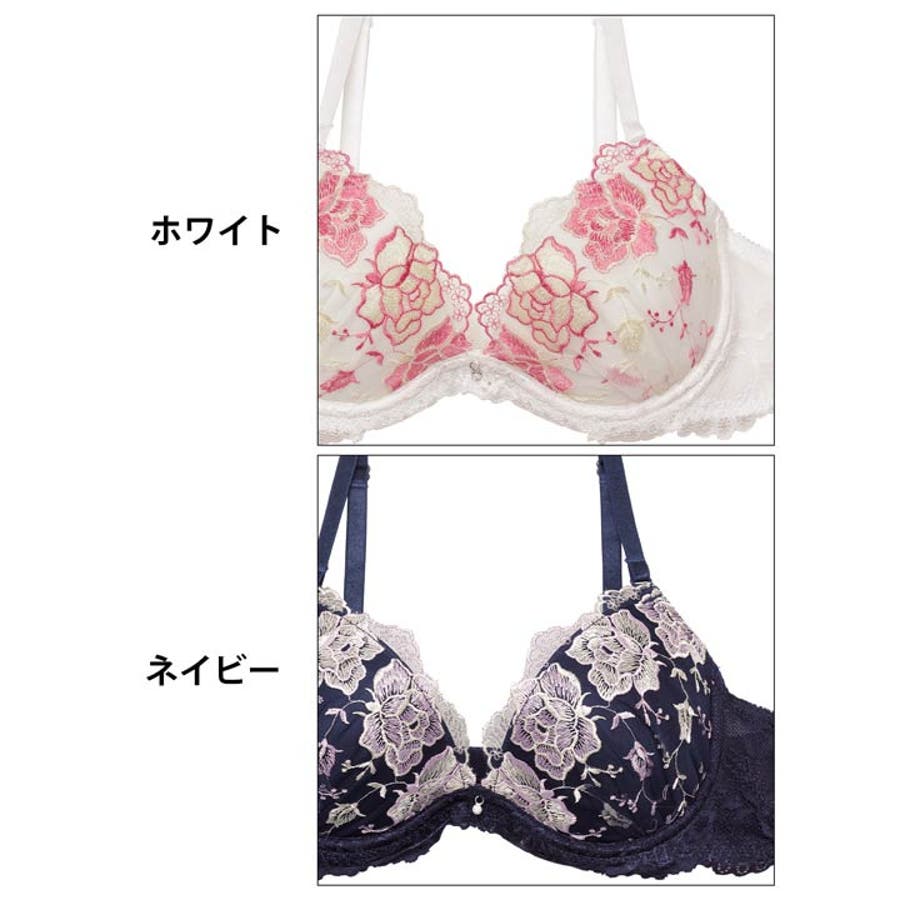2色使いの大輪フラワー刺繍が胸元を彩る華やかなデザインのランジェリー。カップ上部には小花の刺繍があしらわれ、細部まで可愛らしくこだわった仕上がりになっています◎フェミニンな雰囲気のホワイトと、大人っぽく上品なネイビーの2色展開です!