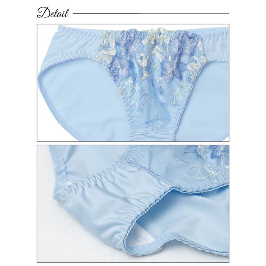 カップから溢れるほどのフラワー刺繍が目を惹く、明るく爽やかなカラーリングのランジェリー。フロントにきらりと光る2連のゴールドチャームがさりげなく上品さをプラス♪ショーツは安心感のあるフルバック仕様でデイリー使いにもぴったいです!