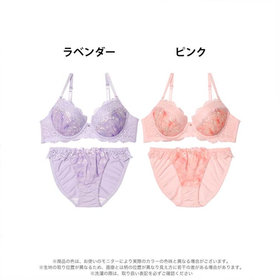2種類の柔らかいレースとお花柄の刺繍を合わせた、乙女チックでキュートなデザインのランジェリー。