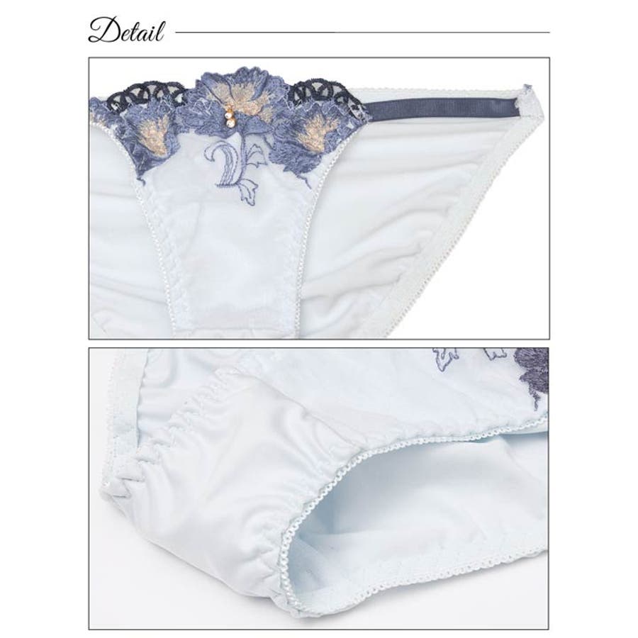 カップ上辺に咲き誇る大輪のフラワー刺繍が美しく印象的なランジェリー。