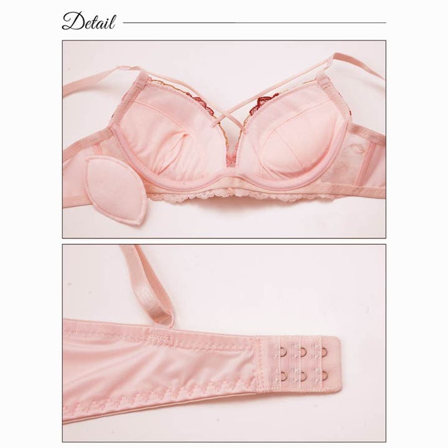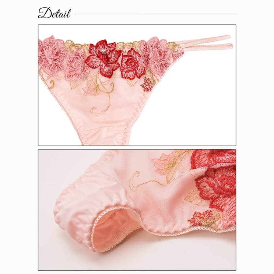 華やかで立体的なフラワー刺繍が優美なランジェリー。クロスするマカロニコードが谷間を強調し、色気を格上げ♪ショーツサイドは2本のストリングから素肌をチラ見せ!腰回りもセクシーに演出します。