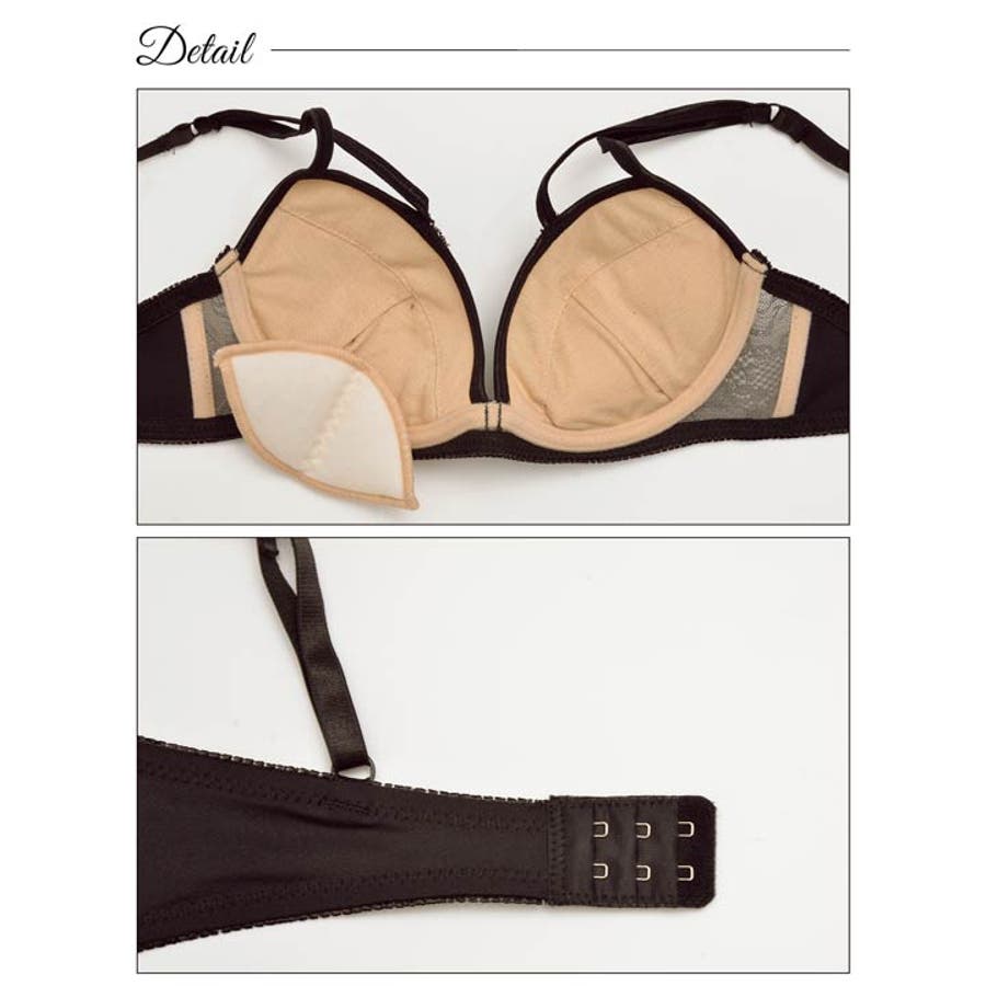透け感のあるカップにレースを重ねた、シンプルながらもセクシーなランジェリー。内蔵&付属のWパッド仕様なのでバストのボリュームUPもばっちり◎ショーツサイドは2本のストリングで素肌をチラ見せします♪
