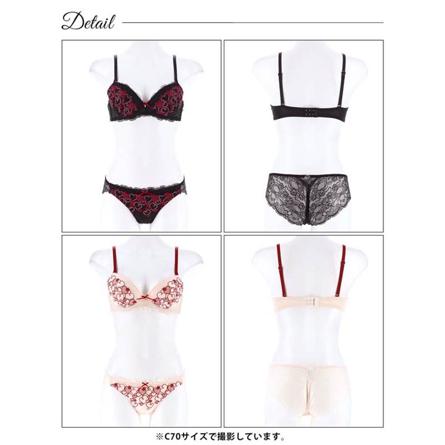 ロマンティックな雰囲気漂うハート柄をたっぷりあしらったランジェリー。甘く柔らかいピンクと、シックな大人っぽさも味わえるブラックの2色展開です♪ 繊細なレースを使用した肌透けが色っぽい印象も欠かさない1着です◎