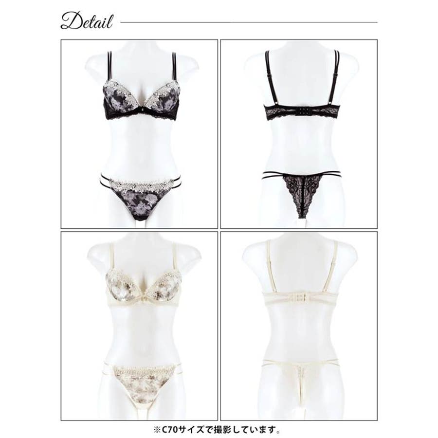 モノトーンのサテン生地に霞むようなフラワープリントが儚げな女性らしさを演出するランジェリー。高見えなケミカルレースを上部に重ね上品さをアップ◎ ショーツサイドの平行ストリングから覗く肌魅せが目を惹く1着です。モデル…Karin