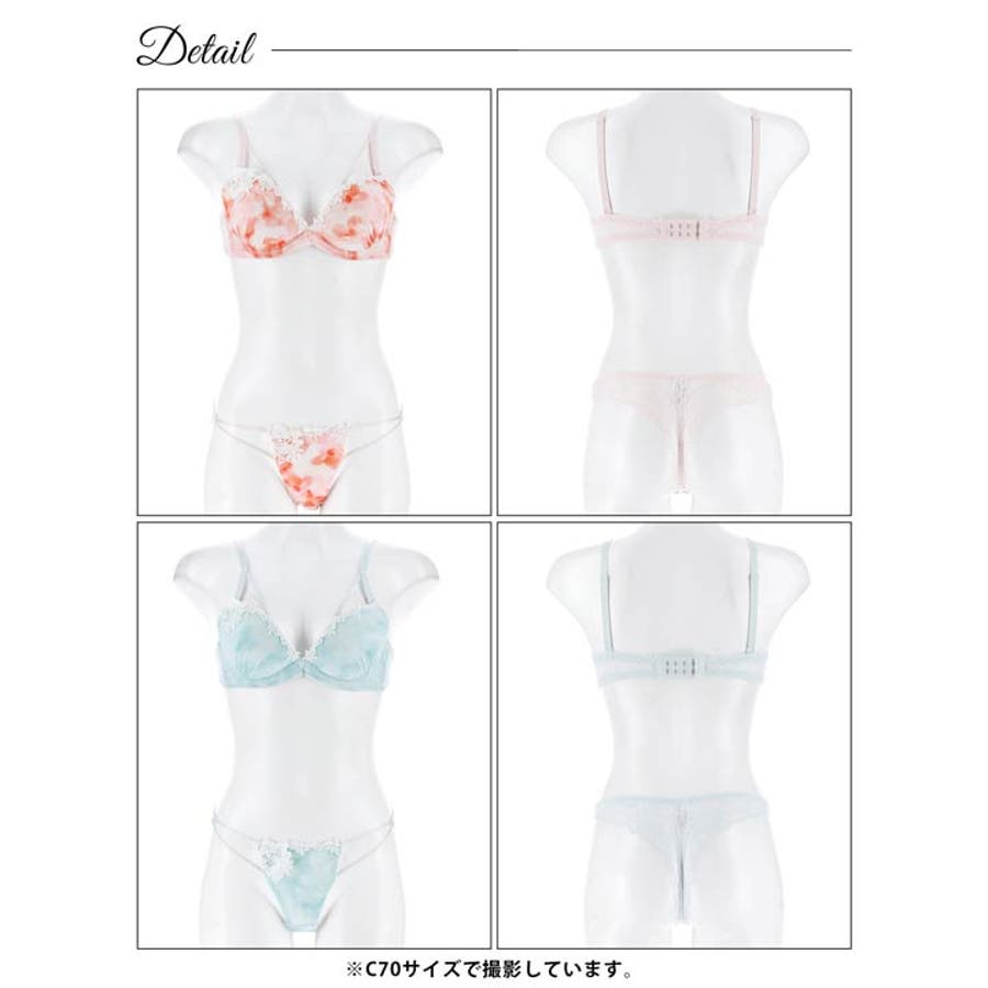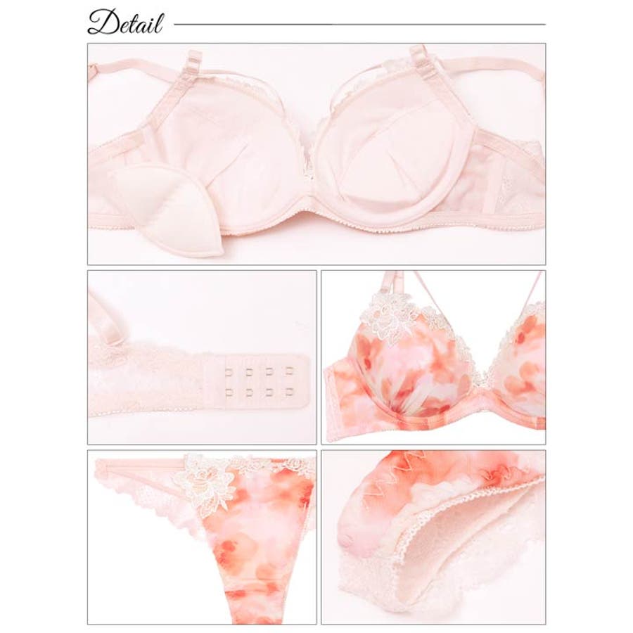 水彩画のような花柄プリントに豪華なお花のケミカルレースをあしらったさわやか×フェミニンなランジェリー。