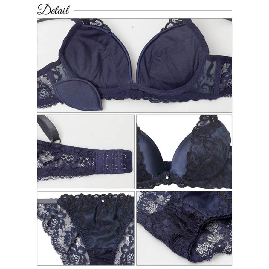光沢のあるサテン地にアイビー柄刺繡レースを重ねた豪華なデザインのランジェリー。内蔵パッド+付属パッドのWパッド仕様でボリュームのあるバストをメイク◎ショーツはバック透けレースで後ろ姿までセクシーに。アウターにひびきにくいのも嬉しいポイントです!