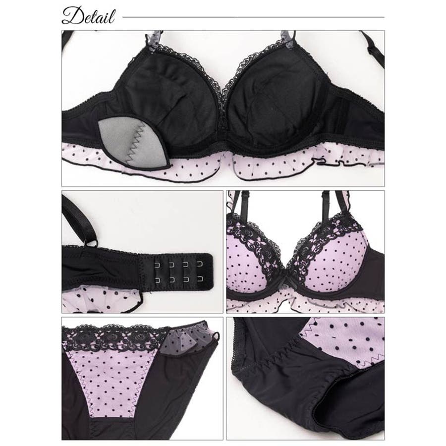 フリルやリボン、ドット柄チュールをあしらった甘めのデザインがとってもキュートなランジェリー。ブラックレースのアクセントで甘さの中に小悪魔っぽい要素をプラス♪ブラのバックにまでフリルがついていて、360度どこから見てもかわいい1着です!