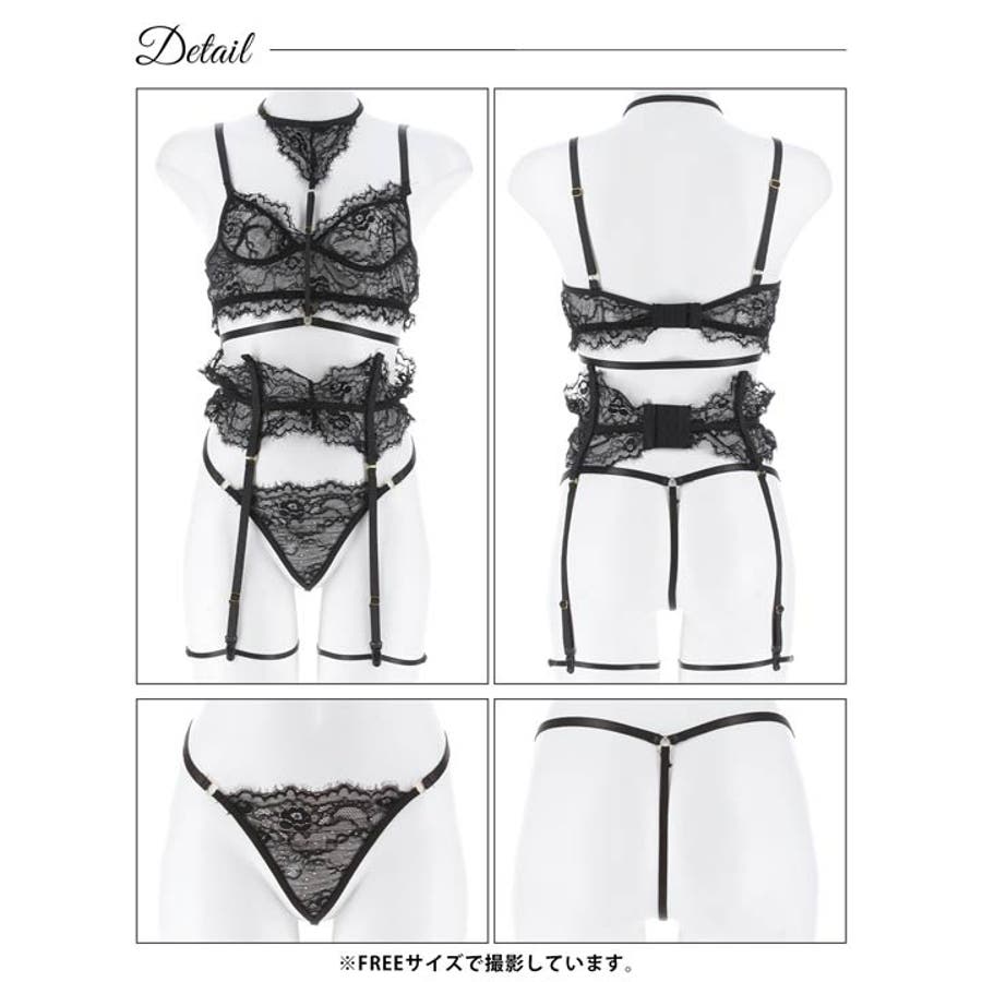 全面シースルーのレース素材が刺繍たっぷりなランジェリー。お手持ちのニーハイストッキングなども合わせやすいワンカラー仕様で、セクシーコーディネートの幅広がります♪ブラジャー・Tバック・チョーカー・足リンクの4点セットです◎ モデル…まぁみ