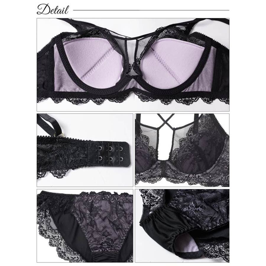 バストを包みこむ繊細なレースにクロスコードでアクセントを加えたラグジュアリーなインポート風ランジェリー。
