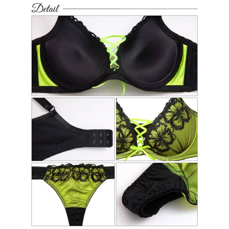 鮮やかなネオンカラーにブラックのフラワー刺繍を重ねた、華やかで存在感のあるランジェリー。