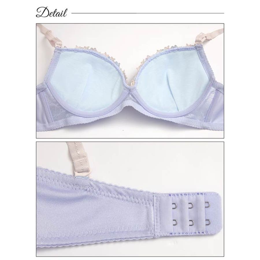 女の子らしい淡いパステルカラーに小さな花々の刺繍ラインがアクセントになったランジェリー。