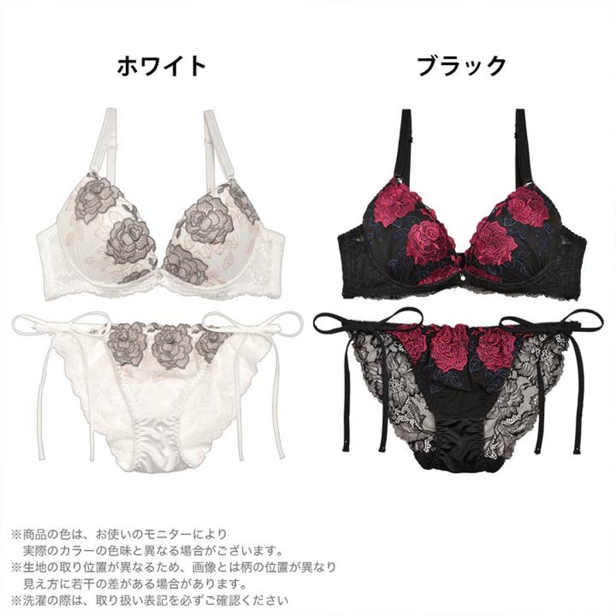 立体的に浮かび上がる大輪の薔薇が胸元を華やかに彩るランジェリー。フロントに輝くチャームがさらに高級感溢れる印象に。DRWオリジナルのショーツはサイドが手結びリボン仕様に、バックは大胆なシアーレース仕立てで色気を加速させます。