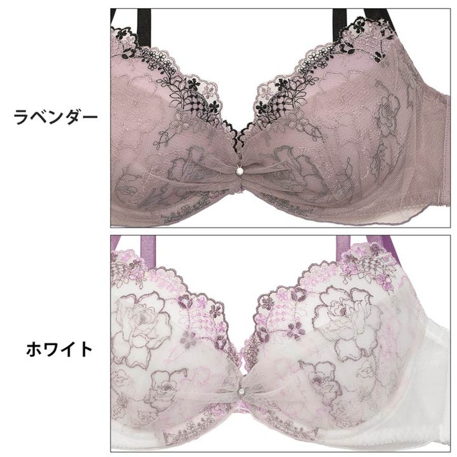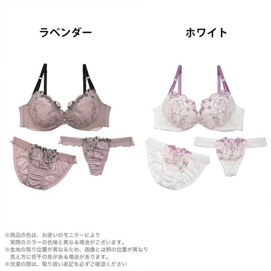 淡いカラーリングに鮮やかな刺繍が美しい生地に、ドレスをまとうようにチュールを重ねた贅沢ブラ。Wパッド、トライアングルストラップ構造でしっかりバストをサポートしてくれます。セットのボトムは気分によって使い分けできるフルバックとTバック。サイド部分にチュールをあしらい、ヒップまわりも優雅に演出します。