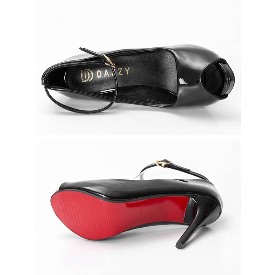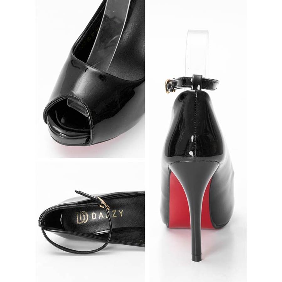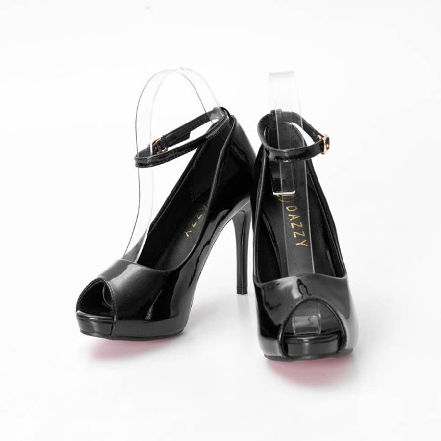 グロッシーラメストラップ付きオープントゥキャバヒールパンプス