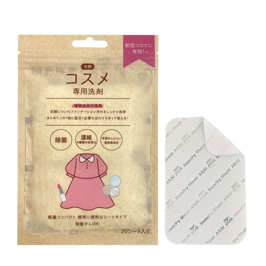 新型コロナに有効な新商品!シートタイプの洗剤です。ファンデーション汚れなどをしっかり落とす実力派。