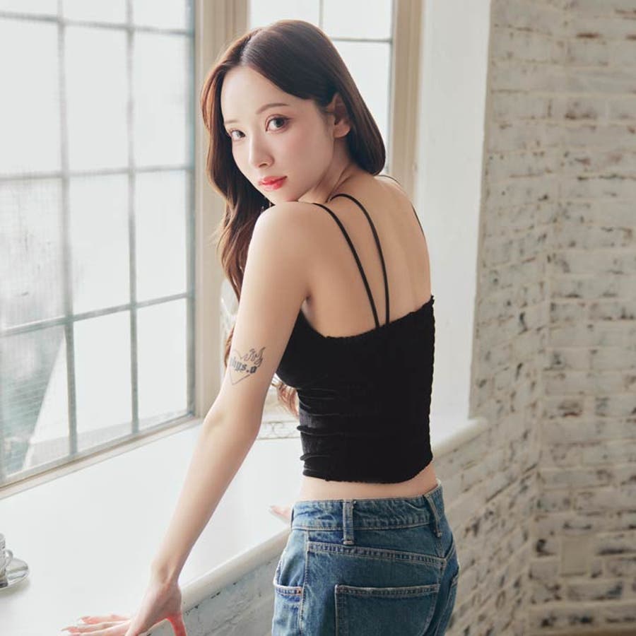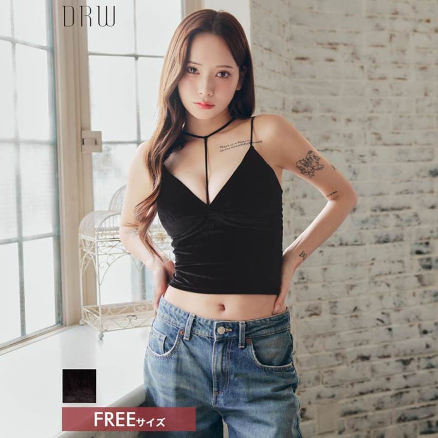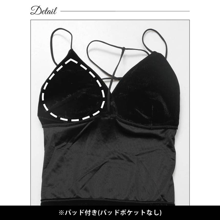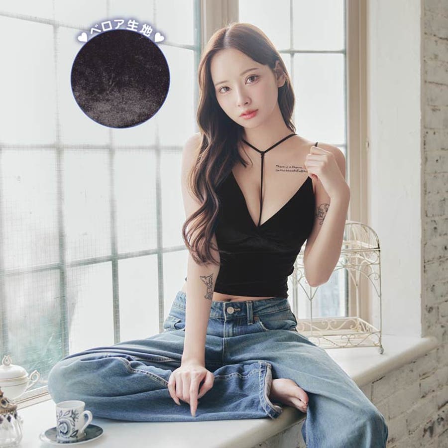 シーズンムード漂うベロア素材を使用したキャミソール。デコルテには華奢なT字のコードをあしらいセクシーなアクセントをプラス♪ヘルシーに1枚で着用したり、カーディガンやシャツのインナーにしたりと幅広いコーデで活躍するアイテムです◎