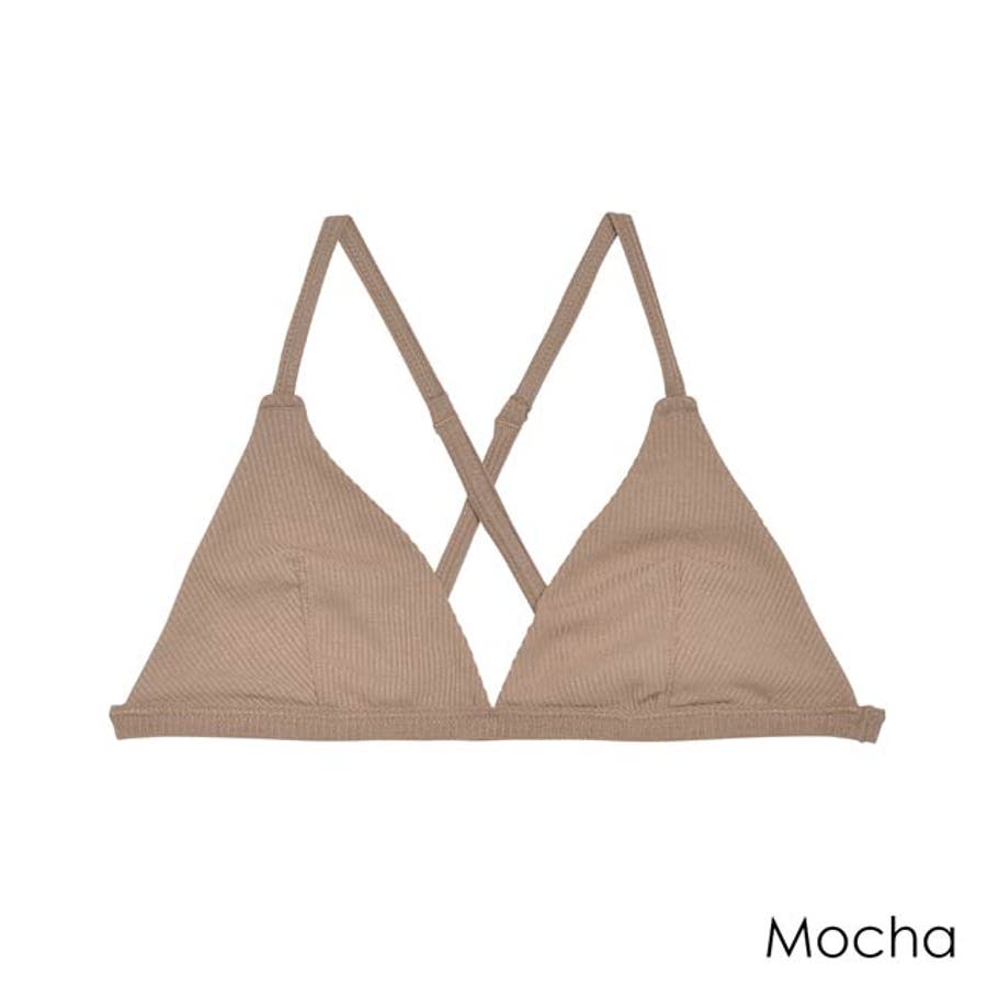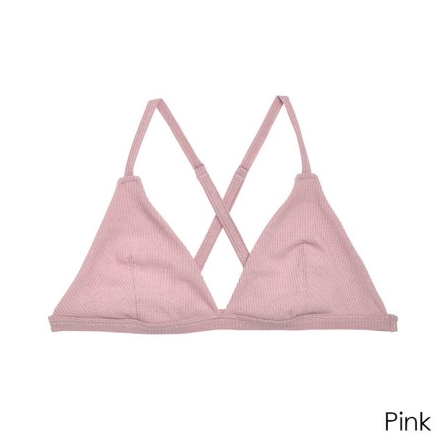 リブ素材の三角タイプのブラレット。バックスタイルはクロス仕様。ストレスフリーにカップはノンパテッド仕様で仕上げました。ホックなしの仕様なので、バックスタイルをみせるコーディネートにもおすすめ。コーディネートを楽しめるようにおそろいのデザインを多数ご用意しています。