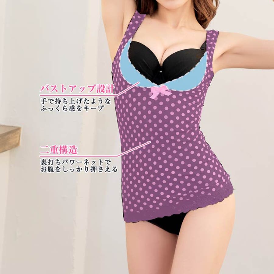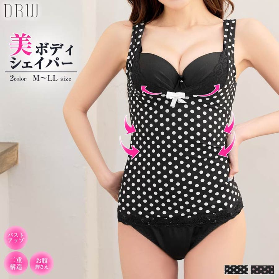 胸元のリボンやレースがポイントになったキュートなドット柄のボディシェイパー。胸全体をぎゅっと持ち上げて上向きの美しいバストラインをキープ◎二重構造のパワーネットで気になるお腹まわりもすっきりシェイプしてくれます♪