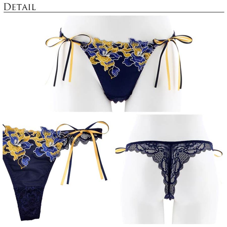 フロントの存在感のある大花のレースとサイドの華奢なリボンがポイント 。