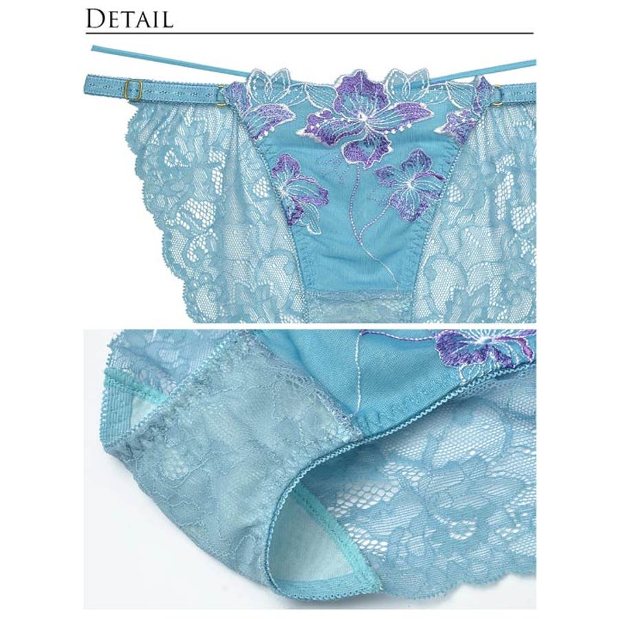 瑞々しい花々の刺繍をふんだんに施したゴージャスなランジェリー。女性らしい曲線を強調するマカロニコードデザインがセクシーなポイント。ショーツのサイドストリングはアジャスター付きなのでお好みのフィット感に調節できます。