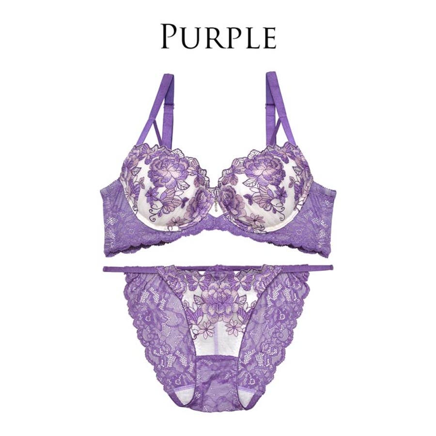 2色使いのピオニーにバタフライが舞う刺繍デザインが上品なランジェリー。中央のカットアウトや繊細なレース透けが妖艶さをプラスします◎ 華奢なストリングは女性らしい曲線美を引き立たせる1着です。