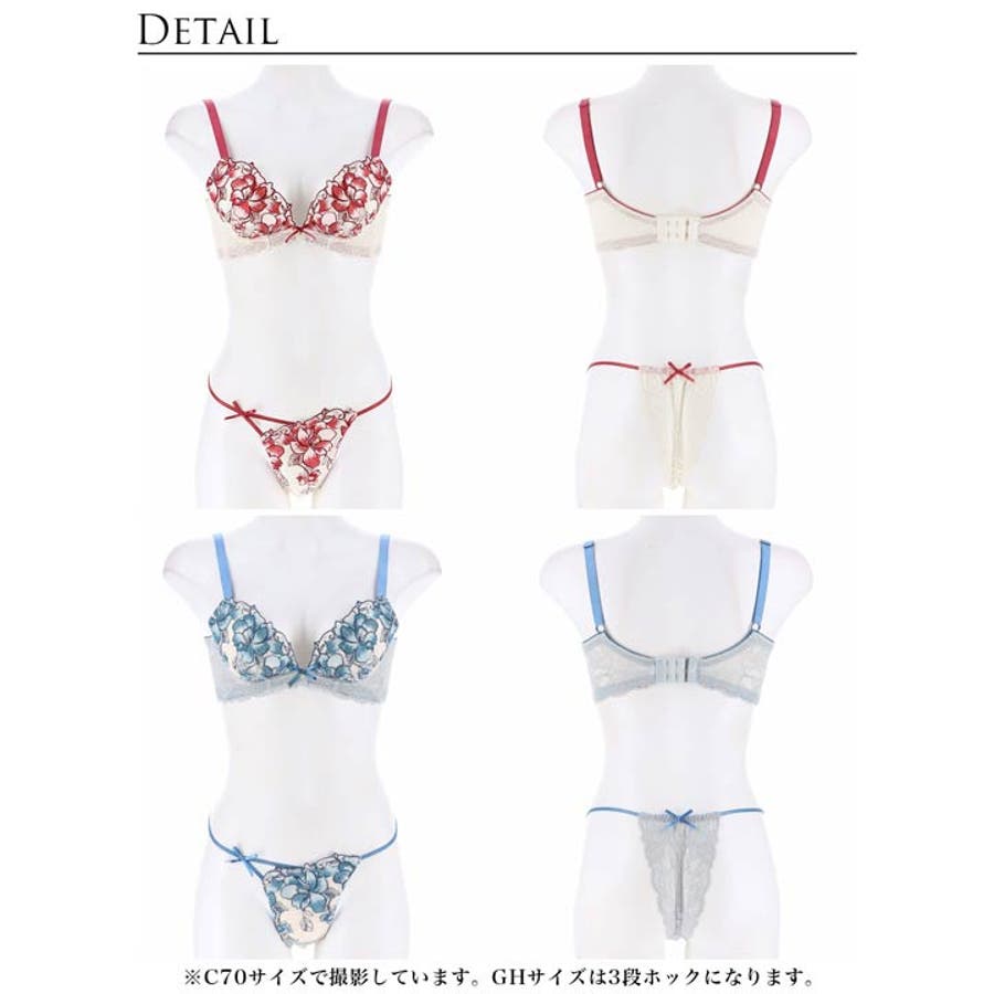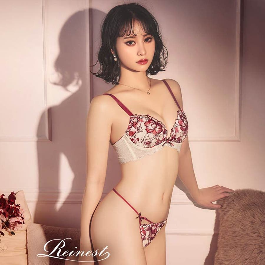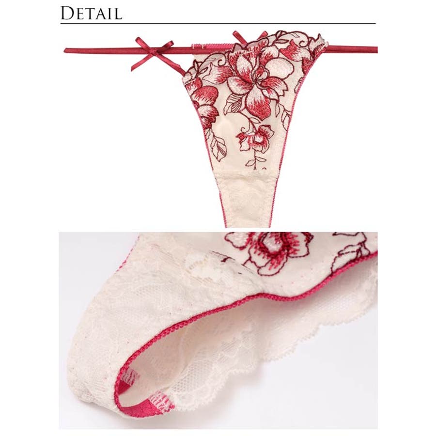ホワイトベースの生地に色鮮やかなグラデーションのフラワー刺繍が隈なく映えるランジェリー。リボン装飾で甘い雰囲気もプラス出来ます◎ フルバックの後ろ姿までふんだんにあしらわれたレース素材、Tバックの華奢なストリングデザインどちらも魅力的な1着です。モデル…永尾まりや