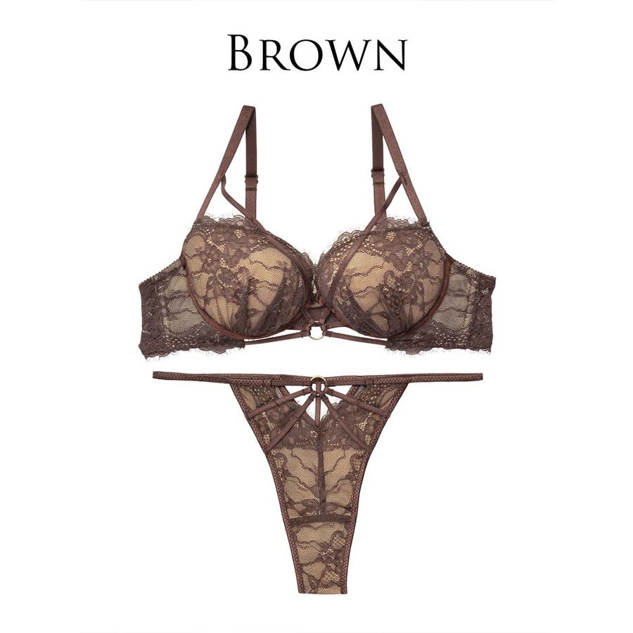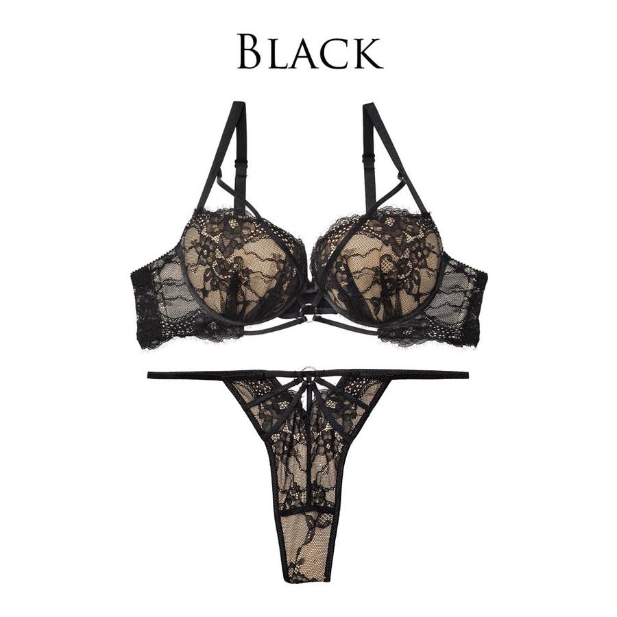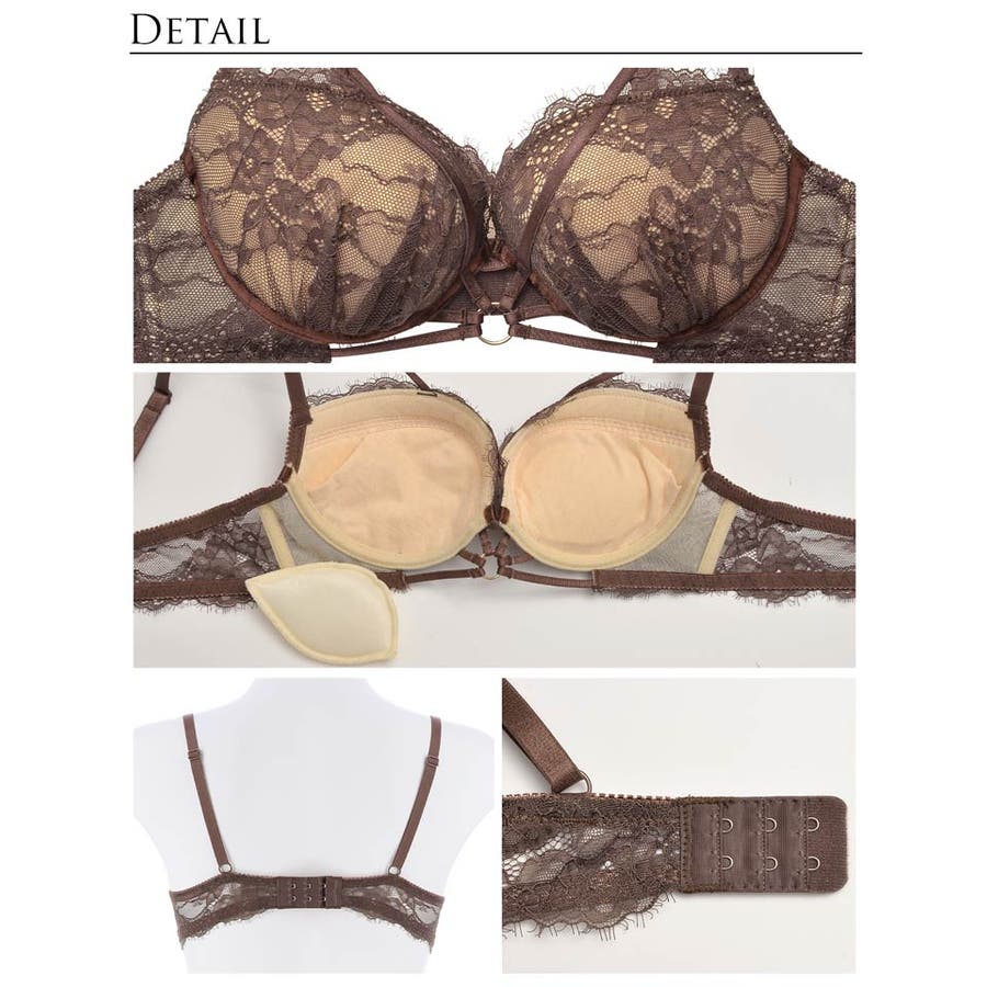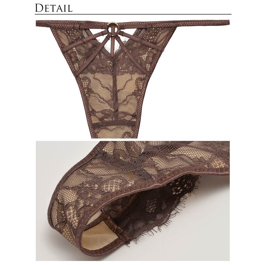 素肌にレースを重ねたようなヌーディーなデザインのランジェリー。フロントのリングにつながるコード使いがセンシュアルな雰囲気に。バックはシアーレースの上品な透け見せで後ろ姿まで色気を漂わせてくれます。