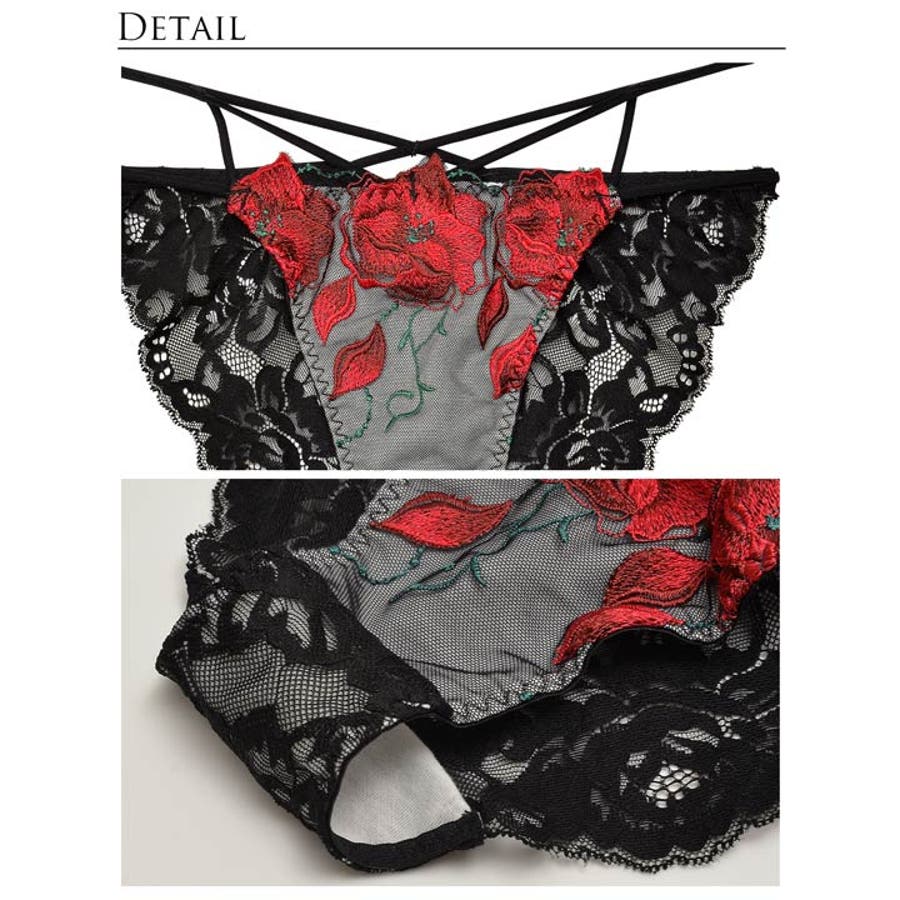 立体的で鮮やかなカラーリングのフラワー刺繍を施したラグジュアリーなランジェリー。デコルテやウエストまわりを飾るセクシーなコード使いがアクセントに。バックはシアーレースで上品な透け見せを演出します。