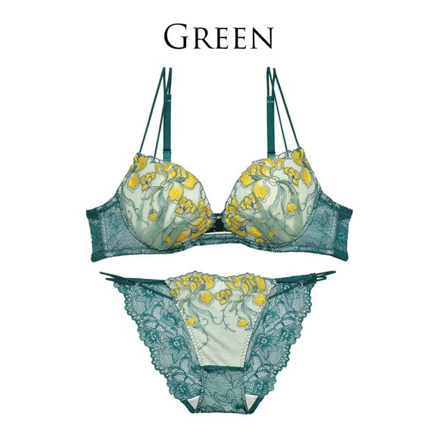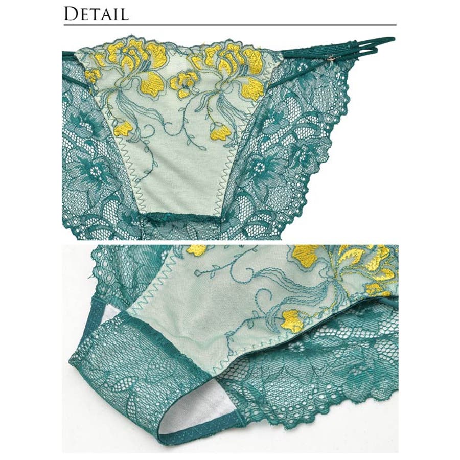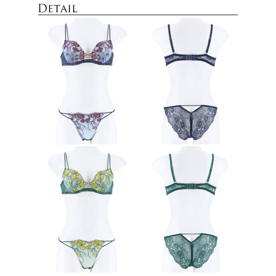 ギャザー寄せした淡いカラーのレースに鮮やかな花々の刺繍が映えるランジェリー。中央が大きく開いたカップで大胆な谷間見せを演出。ショーツバックにもカッティングを施した360度セクシーなデザインです♪