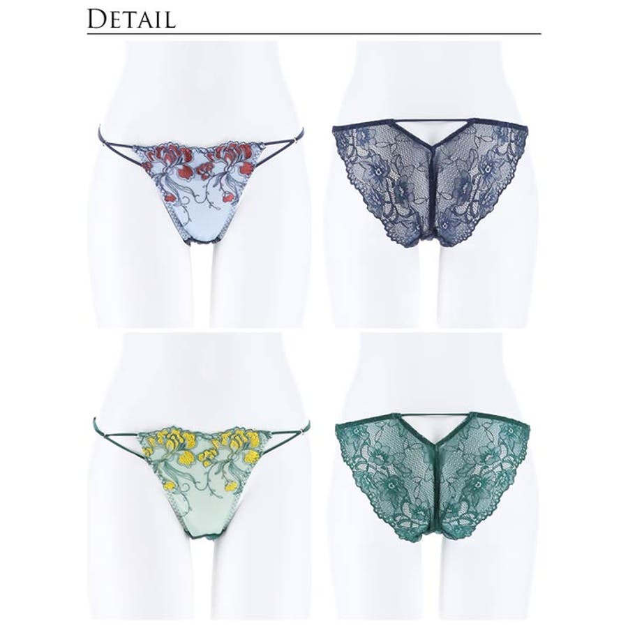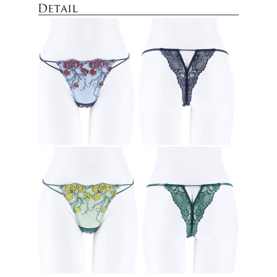 ギャザー寄せした淡いカラーのレースに、鮮やかな花々の刺繍が映えるランジェリー。バックのカッティングデザインやレースの透け感が色気を演出♪サイドは2本のストリングで腰元を華奢見せします。