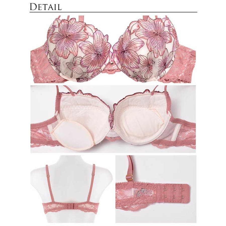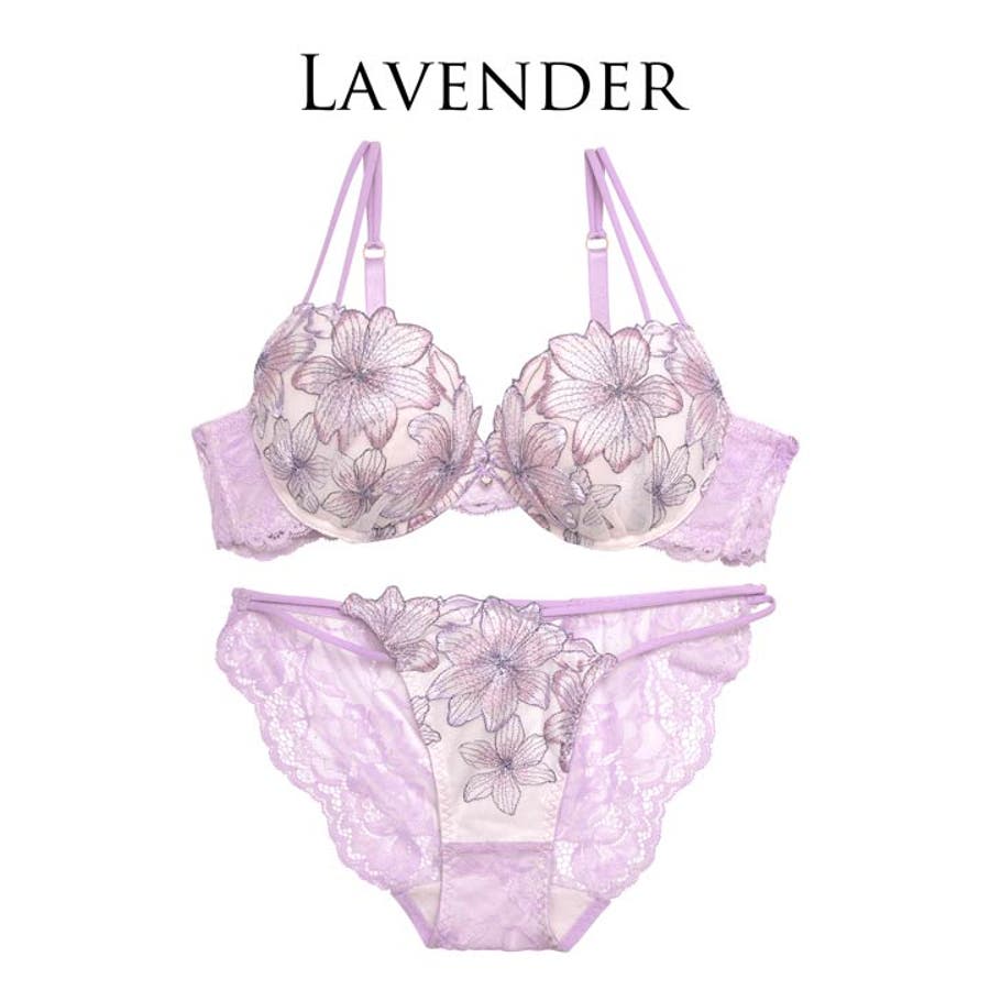 満開のユリが咲く可憐で華やかな雰囲気のランジェリー。中央に煌めくジュエルチャームが高級感を与えます。ショーツはフロントのアシンメトリーデザイン&バックのクロスコードで360度セクシーに仕上げました。