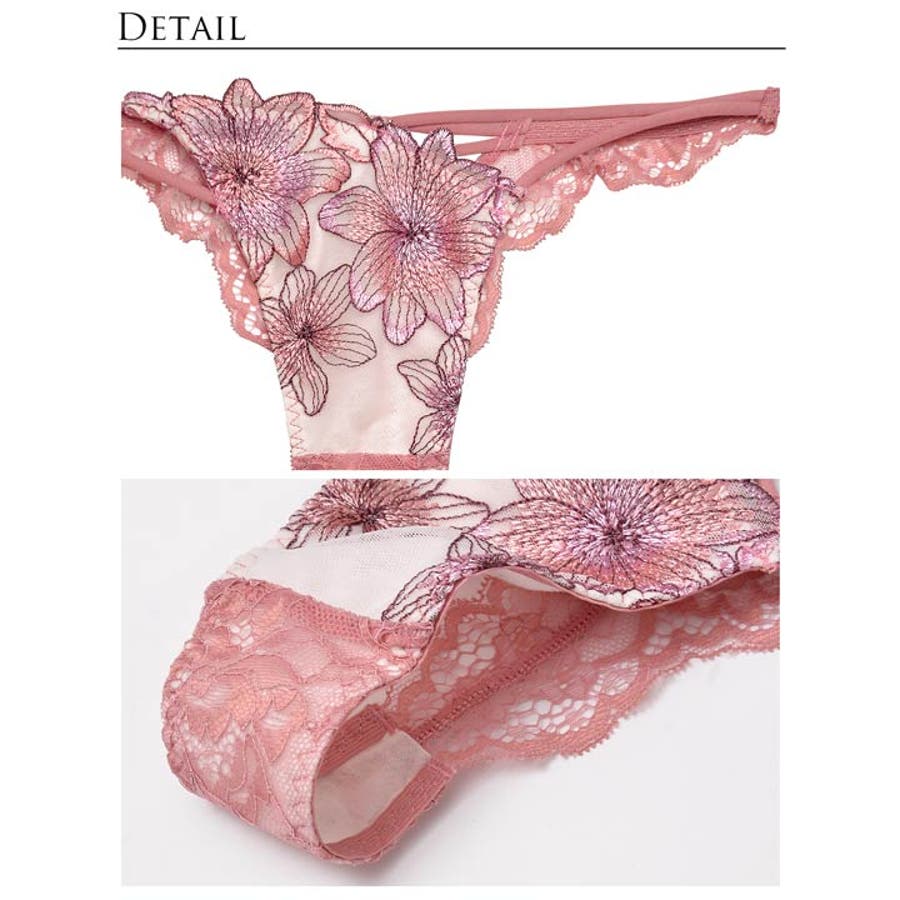 満開のユリが咲く可憐で華やかな雰囲気のランジェリー。中央に煌めくジュエルチャームが高級感を与えます。ショーツはフロントのアシンメトリーデザイン&バックのクロスコードで360度セクシーに仕上げました。