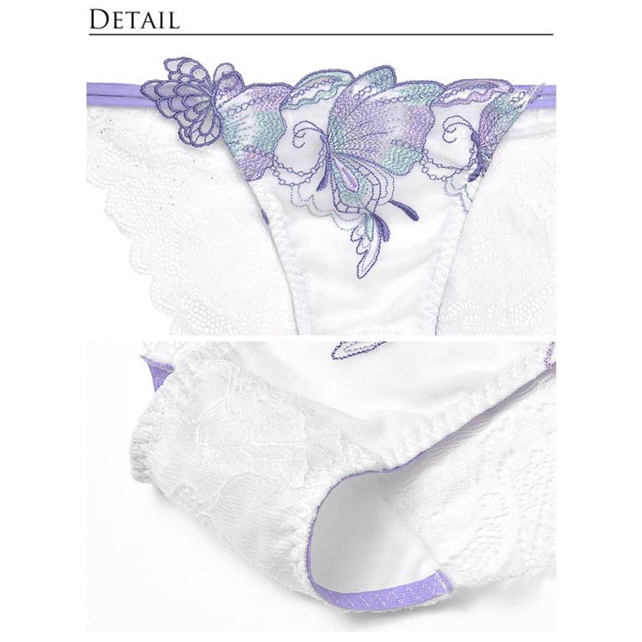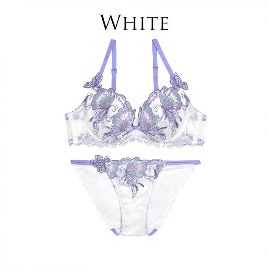 空を優雅に舞うようなバタフライが美しいランジェリー。羽部分の色鮮やかなグラデーションや、肩紐の立体刺繍が高級感を漂わせます。後ろ姿からも色気を欠かさない透け感やレースアップも魅力的な1着です。