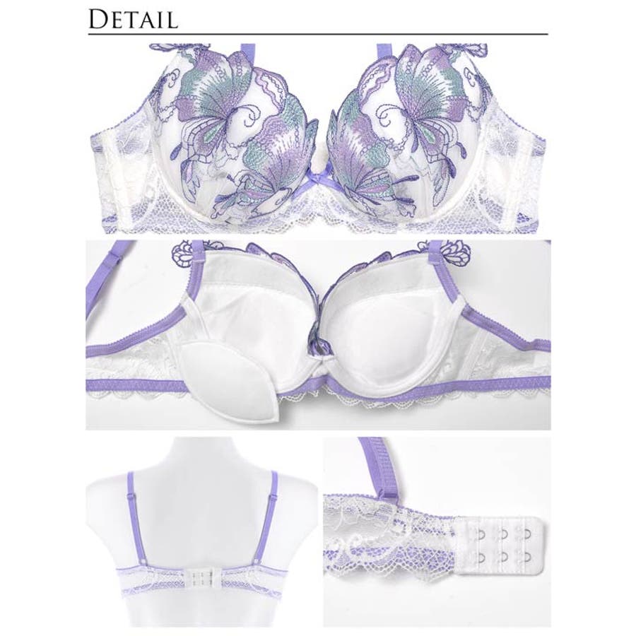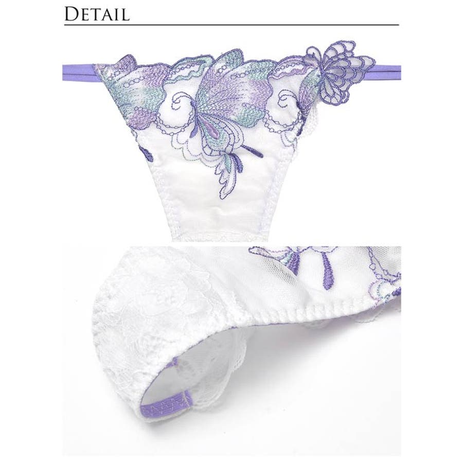 空を優雅に舞うようなバタフライが美しいランジェリー。羽部分の色鮮やかなグラデーションや、肩紐の立体刺繍が高級感を漂わせます。後ろ姿からも色気を欠かさない透け感やレースアップも魅力的な1着です。