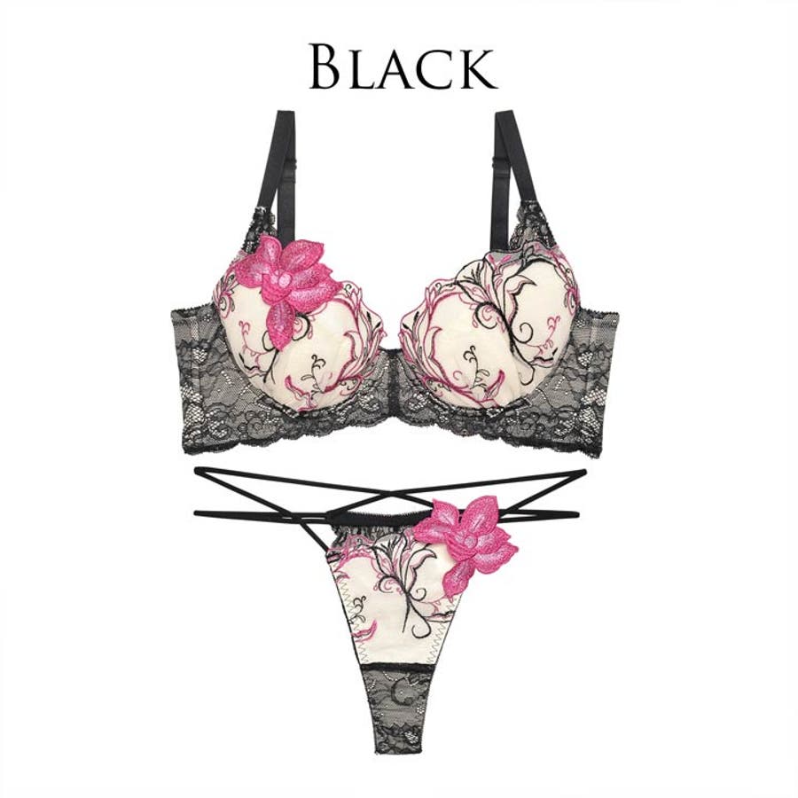 肌馴染みの良いアイボリーの生地に優美に描かれたアイビー柄が上品なランジェリー。立体的なフラワーをアシンメトリーな位置に施しゴージャスな印象に。絡み合うストリングデザインと透けレースも魅力的な1着です◎