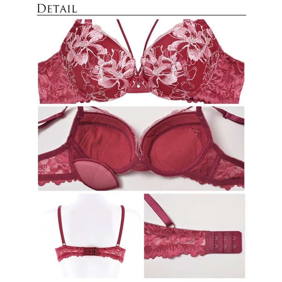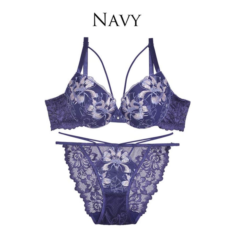 大柄のフラワー刺繍を施した深みのあるシックなカラーリングのランジェリー。バストを強調するマカロニコードが女性らしい色気を演出♪バックはほどよい透け感のフラワーレースで後ろ姿も上品に見せてくれます。