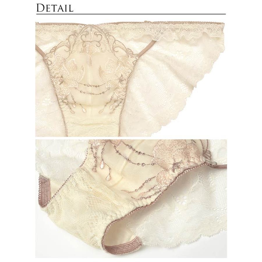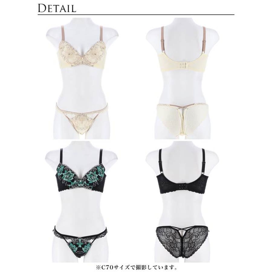 2色使いのグラデーションフラワーに高級感漂うドレープ刺繍を合わせたランジェリー。中心に飾られたドロップパールビジューが上品な印象に。透け感のあるレースにストリングを加え360度色気漂うショーツも魅力的な1着です。
